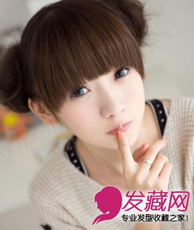 韩国流行的少女系双发髻扎发,这款发型可是卖萌度堪比双马尾,俏皮可爱的发髻扎发很有校园女生的活泼朝气,搭配齐刘海更加呆萌可爱。