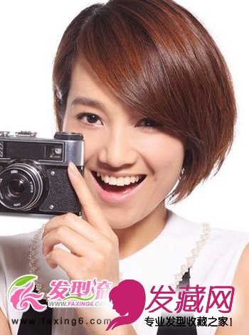 一看到这款干净利落的短发发型,一股职场女王成熟干练的气质味扑鼻而来。中分大气的斜刘海轻轻遮住左边眉毛,是整个人看起来大方高雅;亮丽的栗色染发颜色,提高肤色的亮度,是整个人看起来很健康很有活力。这是一款魅力十足的女生短发发型。
