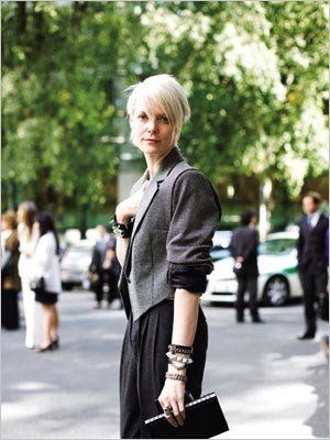 Kate Lanphear的银色短发已经成为她的专属标志,搭配短款的西服和高腰裤更显率直一面。