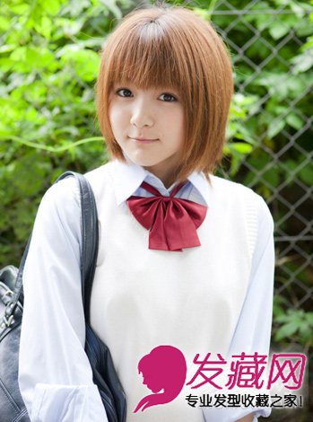 齐刘海的中短发发型,一款比较偏带有日系风格的短发。黄色的染发颜色,很有日系校园美少女的感觉。