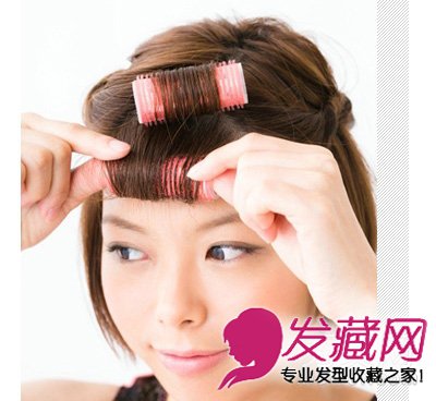 step 6:在刘海喷上定型喷雾然后用小卷发器将头发内卷,营造出内扣的感觉,然后取下卷发器。