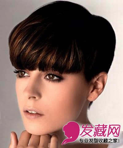 适合长脸的短发发型style5:这款短发发型用厚重的齐刘海遮住了眉毛以上的额头,用棕色的挑染减轻刘海的厚重感,平衡了五官比例,从视觉上缩小了脸型的长度。显得十分温柔知性,没有鬓角的设计把下颌角的曲线完美的展示了出来,显得十分温柔知性与干练并存。