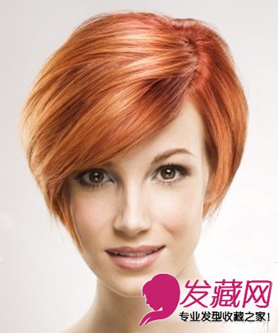 适合长脸的短发发型style7:这款短发发型将额头掩盖在斜刘海下,显示了长脸型特有的窄脸、突出的颌骨和优美的下巴线条的优点。