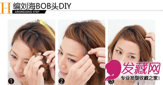 Step1:用扭转的手法将刘海编织在一块,同时增加发束上的刘海,一直往下编。