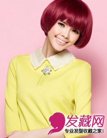 酒红色的波波头充满个性感,时尚抢眼,齐刘海短发凸显圆脸菇凉的五官,穿搭黄色裙装,更添清新感。