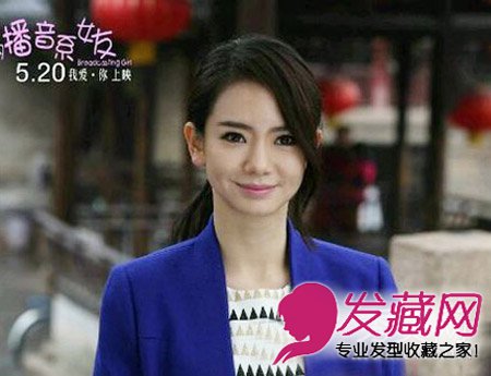 比较干练的职场系发型,长发扎起低马尾,卷卷的长刘海修饰脸型,蓝色西服散发出干练优雅女人味。