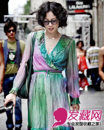 蓬松感的短发蛋卷头,个性时髦,中分刘海气质瘦脸,墨镜和渐变色连衣裙搭配时尚吸引眼球。
