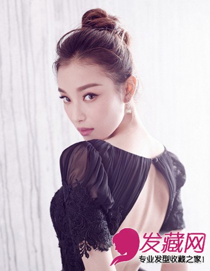 将咖啡色头发高高梳成丸子头,露出光洁的额头,立马提升优雅的淑女气质,同时还能够突出白皙肌肤。