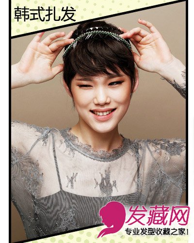 无刘海的长发利用发尾打造出独特的刘海盘发造型,搭配闪耀发箍可爱俏皮。