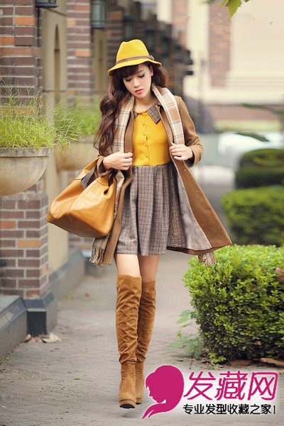搭配大卷发的设计很显女人味,格子连衣裙的搭配又展现了一种轻熟之美。