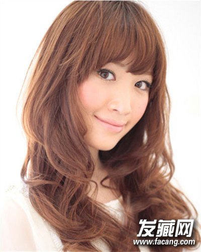 大波浪卷发可以通过发行型的波浪弧度修饰脸型哦,特别是在耳际位置做适合的弧度就可以将脸型从视觉上收窄,大波浪很有温柔的感觉呢,加上略带蓬松的齐刘海,增添少女感。