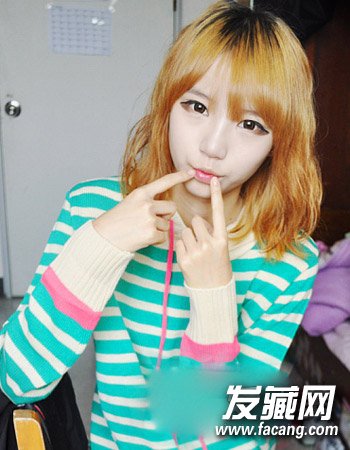 首先是橘黄色发色将时尚感带出来,简单的齐肩烫发随性自然不会显脸小,展现出个性的同果也十分修颜。