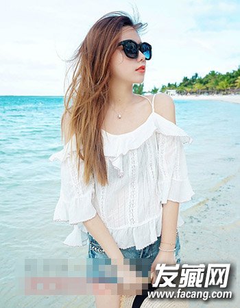 柔顺飘逸的长发随风舞动,发色染成了很时尚的黄棕色,在这夏日的清凉海边,展现了非常出色的时尚潮流感。