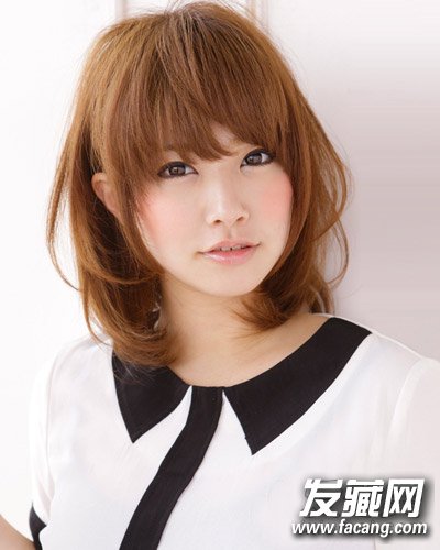 中短梨花头,只是在发尾处做了一个内扣的效果,零碎的齐刘海灵气十足,棕色的发色增添时尚感,打造出优雅的气质。