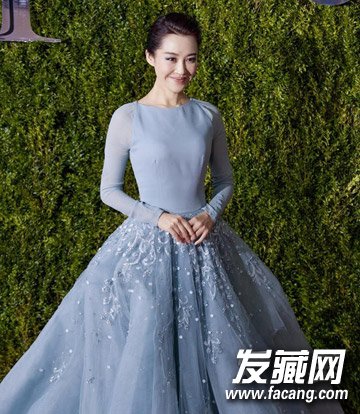 女神近期造型,湖蓝色长裙走起仙女路线,利落盘发显露精致五官,简单迷人,淡淡笑容超养眼。