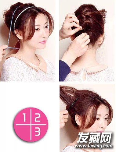 Step3:选择简单的白色发带,在发髻最边缘处缠绕一根,在发髻上缠绕一根。