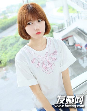 甜美范十足的一款90后清纯发型,简约齐脖短发染出时尚的棕色发色,将女生白皙肤色衬托的更加细腻迷人。空气感刘海下巴掌大的小脸更是十分可爱。