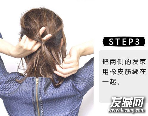 STEP 3:把两侧的发束用橡皮筋绑在一起。