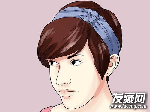 细长的围巾最适合做这一种方法。按长度将围巾对折,一端形成环,一端为两条尾端。将其围在头上,使环和尾端都位于额前。将两端穿过圆环,然后折回,塞到头巾里面或是用发卡固定。
