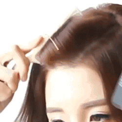 有规则的波浪Lob看起来会特别甜美,如动图所示,将头发二八分开,先用吹风机吹刘海处的头发,再转动夹板做波浪卷。