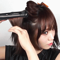 用卷发棒将两侧的头发发尾烫得向内扣。再如动图所示,用卷发棒向内侧卷。