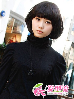 蘑菇头短发突显了脸型,令五官一览无遗。耳朵两侧彭涨外扩的效果打造了女生可爱的气息,丰富了发型层次。齐刘海与两侧短发的搭配可以缩小脸部面积,搭配黑色高领上衣,可爱中增添了几分酷感,很有个性。