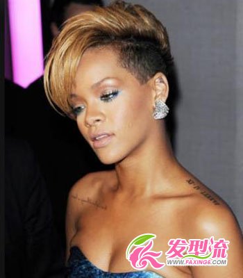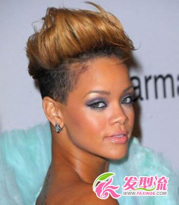 斜庞克 今年最热的斜庞克发型,也叫二区分式发型,很像街霸中的人物。短发两侧修剪得干净利落,让人感觉充满了阳光明媚的气息。发量集中在中间和刘海部分,形成强烈的对比效果。闪亮的耳钻再加性感抹胸长礼服,靓丽抢眼。