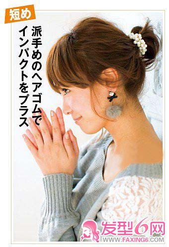 短发的人,不管怎么,也要讲丸子稍微弄小些。选择有冲击力的装饰发圈,可以增加存在感。