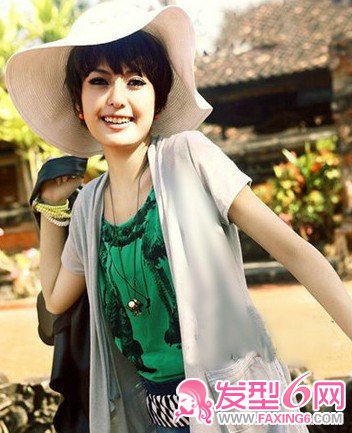 最大程度展现女人帅气的短发发型,靠在脸型和额头的发丝,长度上的控制没有多少差别,刚好到眼睛和盖住额头的发线修饰脸颊,圆圆的方正脸型,可爱俊俏,一顶大大的度假帽,释放出夏日休闲气氛,清爽轻松。