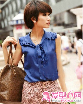这款短发给人成熟优雅的感觉,自然的发色上挑染几分的棕红,显得时尚又健康,而额头上厚厚的偏分刘海,盖住大部分的面积,脸型显小巧,后部的发丝,做出收敛的秀发,梳理直顺,使造型看起来简洁清爽,尽显职场女性的大方自信。