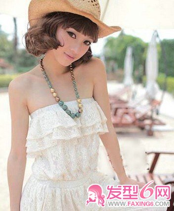 长度控制在脖子以上的荷叶头发型,脸颊两边的发丝做出漂亮的卷曲,大幅度破环平衡感的设计,加上到眼睛的平刘海,尖尖长脸立即变瓜子小脸,白色雪纺裙和米黄色帽子,清新浪漫的夏日度假范儿。