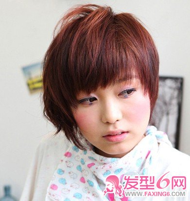 酒红色不对称女生短发,盖住额头的刘海,到眼袋的长度,突出乌亮的大眼和圆圆的脸颊,红红的妆容,带来红苹果般的可爱感觉,脸颊两边的不对称设计,左右不一的长度,巧妙修饰脸颊,酒红色的染发颜色,整款发型更前卫时尚,大方帅气。
