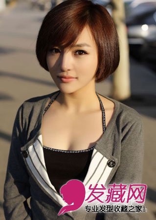 头短发+深棕色染发,一款很代表性的BOBO头,经典不过时,斜刘海的设计很能修饰脸型,自然的颜色,给人一种很淑女清新的感觉。