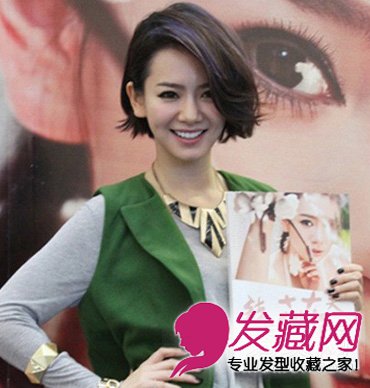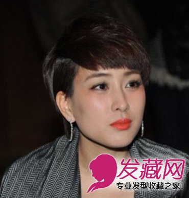 戚薇很适合打理一款时尚短发发型,将一侧头发收在耳后,搭配斜长的刘海,气质十分。