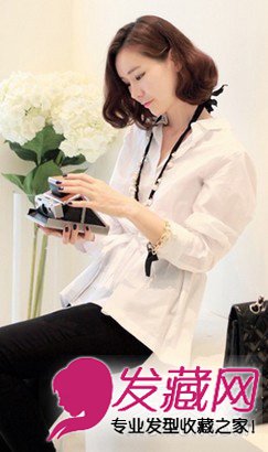 依旧是中分的梨花头发型,在原有的中短发的基础上,加上了波浪般的烫发效果。配上白色的衬衣,绝对的OL范,非常的精致高贵。