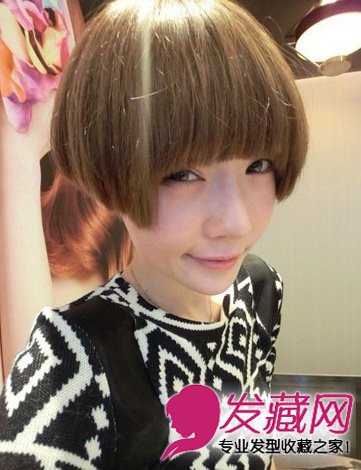 齐刘海的蘑菇头,前长后短的设计。这绝对是一款非常时尚的蘑菇头短发,带有一点点男孩子气。配上金色的染发颜色,跟是街头潮人一个呢!