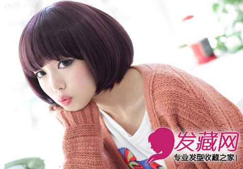 齐刘海的波波头短发,此款短发非常的圆润饱满。顺滑的柔软发丝,展现出甜软的感觉。配上紫色的