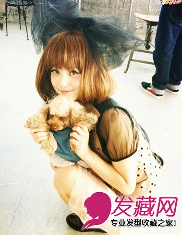 齐刘海的中短发发型,是一款比较偏日系的甜美短发发型。金棕色的染发颜色,尽显日系少女的甜美感。大大的蝴蝶结发饰,非常的抢镜呢!