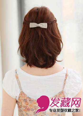 打造方式:简单的从两侧编麻花辫,在后脑用发夹固定,然后用梳子将蝴蝶结发饰上部头发打蓬。