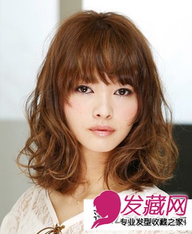 深棕色的染发颜色加上不规则的卷烫造型将气质感展现出来,齐刘海流露出减龄又脱俗的效果。