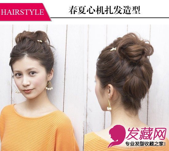 发型点评:长发全部盘在头顶,露出小巧的脸蛋,一只晶莹的花型发饰点缀,精致灵动,尽显清新感。