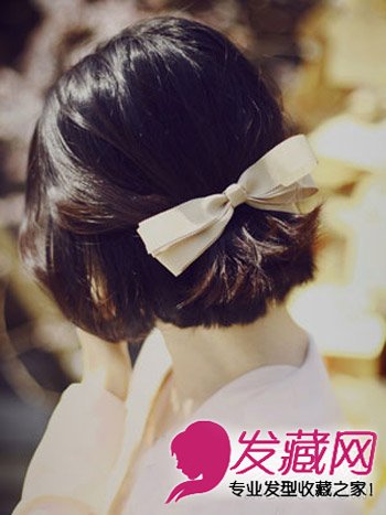 扎发,简单的波波头短发在脑后扎蓬松随意的发辫,搭配蝴蝶结发饰绑扎,瞬间提升优雅气质。