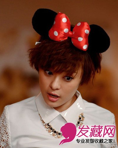 辣妈正传中蓬松玉米烫短发造型搭配可爱的米妮发箍显个性,展现可爱的一面。