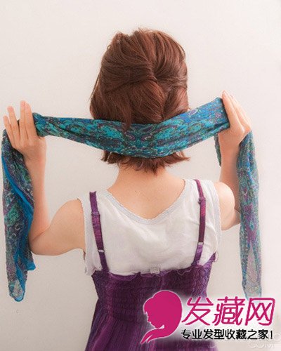 STEP 5:把头巾放在后脑勺的位置,准备往头顶处绕。