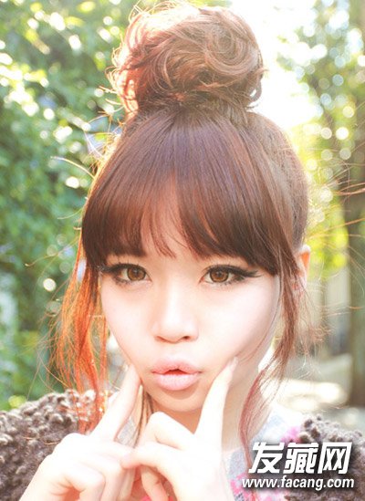 丸子头也是很瘦脸的发型哦!齐刘海遮住额头,头顶一个可爱的发髻很Q很活泼,刘海两侧散落的长发和嘟嘴卖萌的表情都很修颜,小脸也可以嗲嗲的!