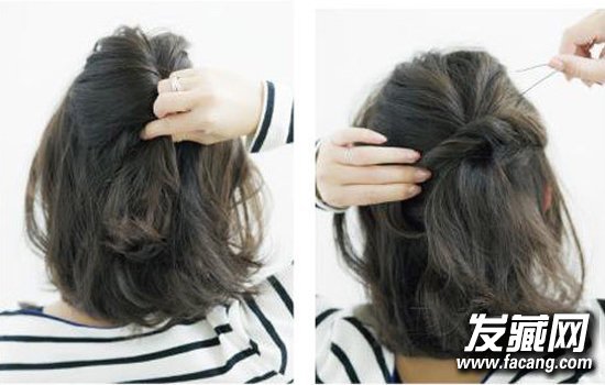 1.脸周围留出头发,在头部左侧抓取一股的头发,向右扭转,用一字夹固定在后脑勺中心位置。