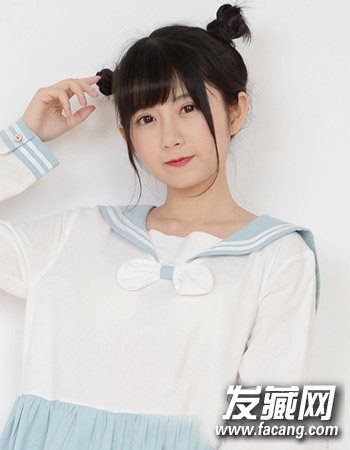 一款活泼可爱感十足的校园女生发型设计,乌黑亮丽的自然发色清纯迷人,而齐刘海形式的发型与双丸子头形式的扎发更添十足活泼俏皮范儿。