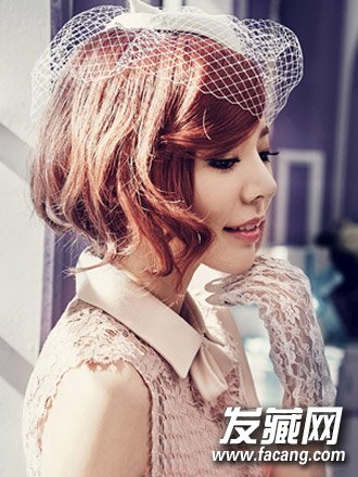很有复古韵味的一款韩式甜美短卷发烫发,红棕色的挑染发设计衬出白嫩肤色,斜刘海短卷发自然卷翘,搭配发饰尽显名媛淑女气质。