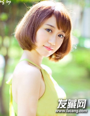 内扣短发时尚清新。而且斜刘海搭配与绿色上衣显露出清新明媚感来,十分讨喜。