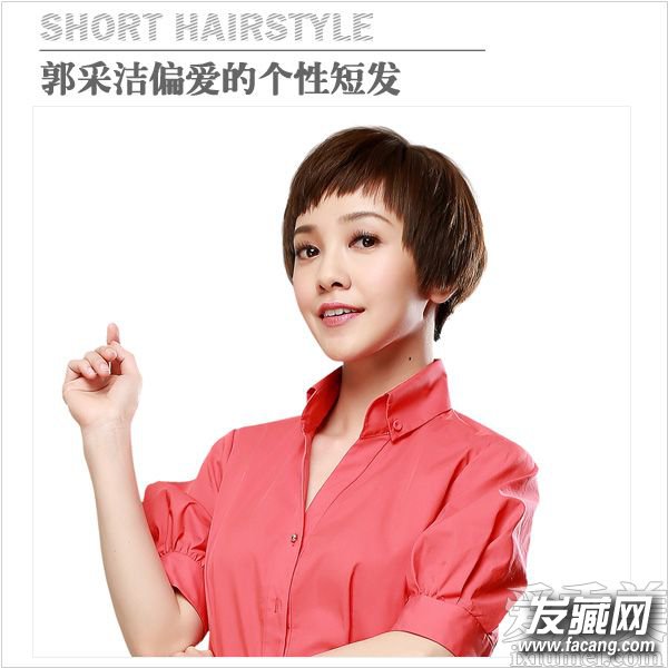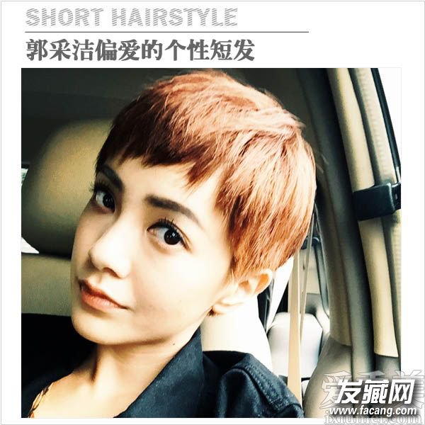 这种清爽利落的露耳短发造型是很多女生难以驾驭的发型,而郭采洁却演绎出不一样的味道,搭配金铜色的染发,更显时尚魅力。